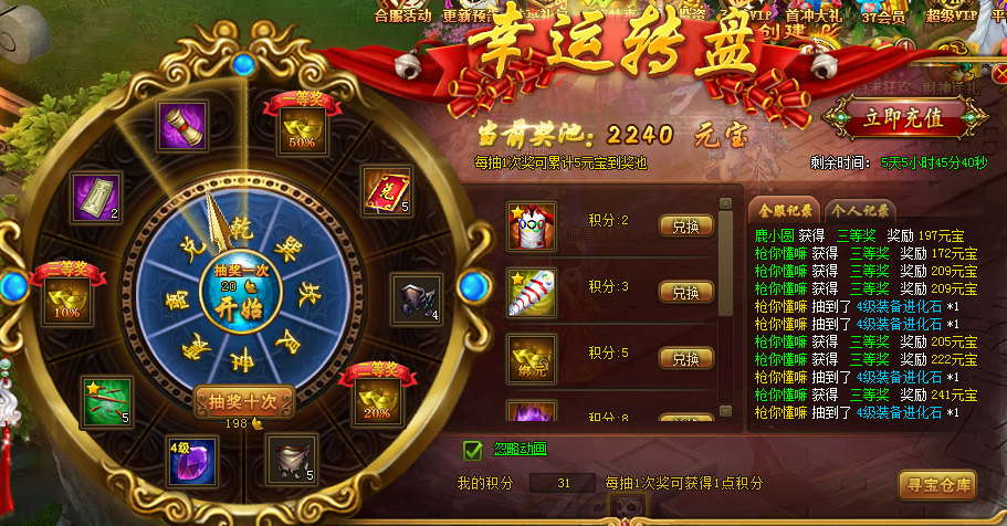 活动规则:活动期间内,玩家消耗一定量元宝来进行抽奖,玩家每抽奖一次,将会有5元宝计入奖池中,初始奖池1000元宝,玩家通过抽奖扩充奖池深度,抽奖可获得积分,每抽奖1次可获得1积分,积攒积分可以获得额外珍稀道具。