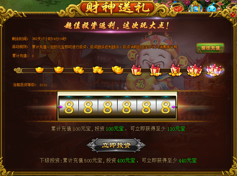 活动规则:活动时间内,玩家累计充值达到一定数量,即可进行投资,投资后立刻返还一定数量元宝,具体返还数量在一定比例内波动,投资分为几级,完成当前投资后才能进行下一级投资。