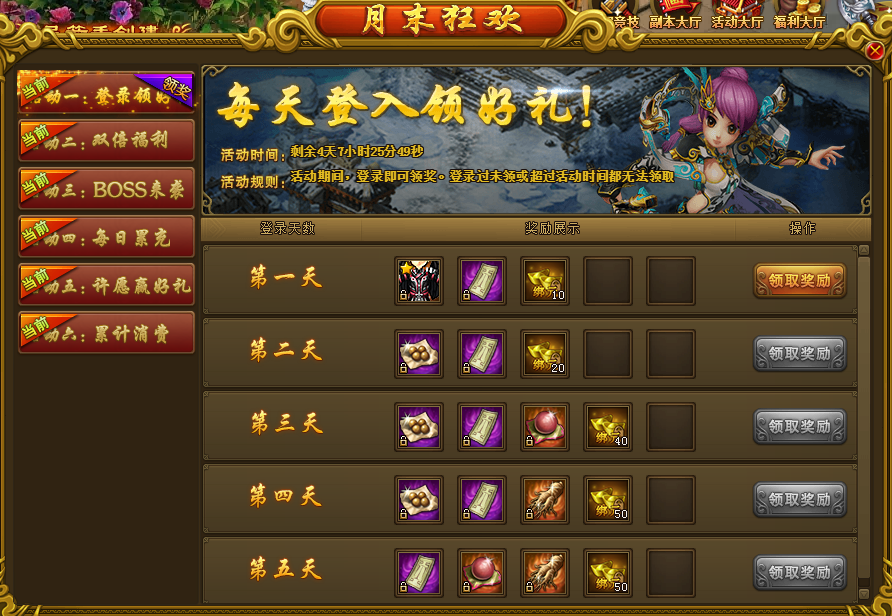 活动规则:活动期间登录即可领取相应礼包(全部绑定);
