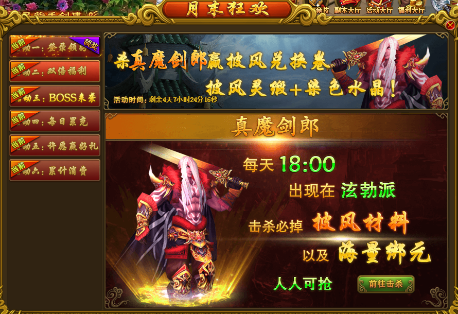 活动规则:活动期间,每晚18:00,真魔剑郎都会出现在泫勃派地图内,玩家击杀世界BOSS即可掉落海量绑元,橙色装备,以及稀有珍惜道具。
