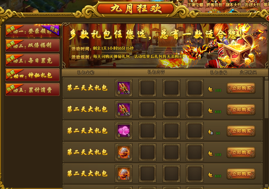 5. 每日累计充值10000元宝可获得:(6级武攻、6级追伤、6级武防、6级防御)4选一、绑元*1000、副本卷轴*20、披风兑换券*40、本职业+通用初级热血石*1;