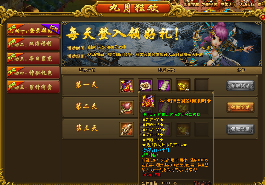 4. 每日累计充值2000元宝可获得:(姻缘石*10、中级暗器碎片*20、突破丹*8、铸造石宝箱*20)4选一、绑元*500、副本卷轴*10、披风兑换券*40;