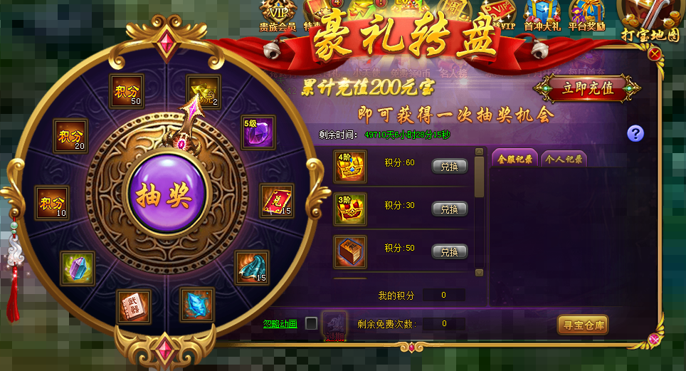 活动规则:活动期间内,玩家每累计充值200元宝,即可获得一次抽奖机会,抽奖可获得珍贵道具和积分,积分可额外兑换稀有道具。