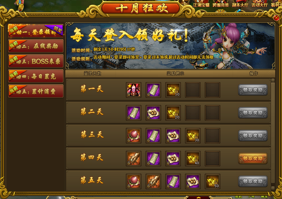 1. 第一天登录即可领取:10绑元、剑郎美娘披风限时卡*1、副本卷轴*1;