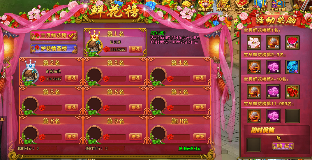 活动规则:活动期间内,收到鲜花数量达到100朵即可获得宝贝鲜花榜上榜资格,赠送出鲜花数量达到100朵即可获得护花情圣榜上榜资格,活动结束时邮件发送对应榜单排名奖励。