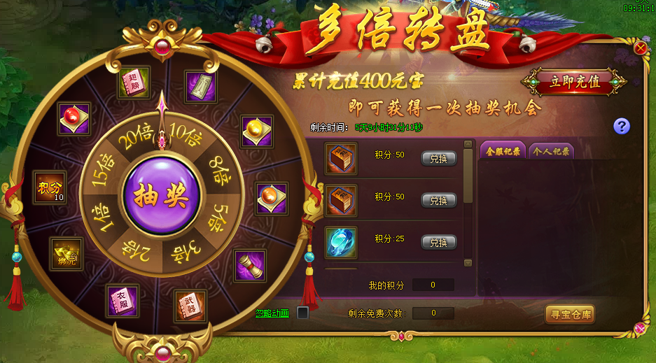 活动规则:活动期间内,玩家累计充值满400元宝即可进行抽奖,抽奖获得道具数量将会乘以对应倍数,积攒积分可以获得额外珍稀道具。