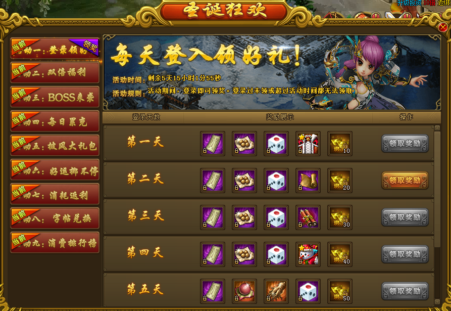 5. 每日累计充值10000元宝可获得:(6级武攻、6级追伤、6级武防、6级防御)4选一、披风兑换券*40、绑元*1000、本职业初级热血石*1;