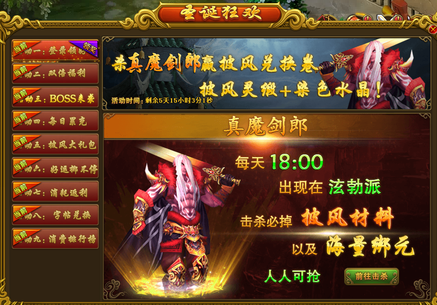 活动规则:活动期间,每晚18:00,真魔剑郎都会出现在泫勃派地图内,玩家击杀世界BOSS即可掉落海量绑元,橙色装备,以及稀有珍惜道具。绑元绑定);