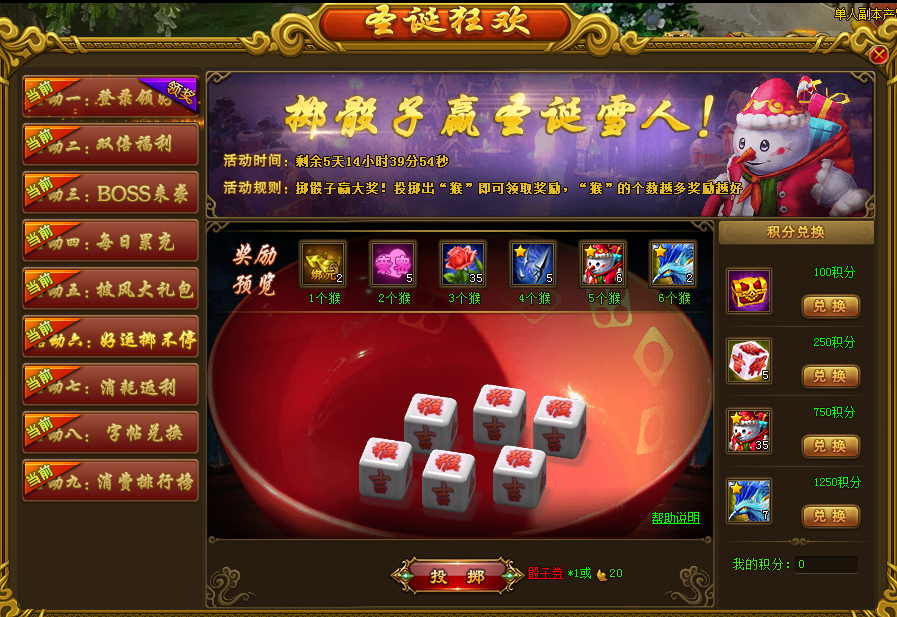 活动规则:活动期间,通过投掷骰子来获得奖励,投掷出“猴”字即可领取奖励,“猴”字的个数越多,奖励越丰厚;