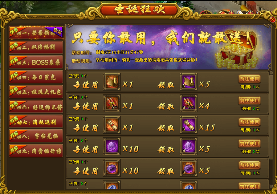 活动规则:活动期间,玩家消耗对应数量道具可以直接领取道具返利,使用越多返利越多;