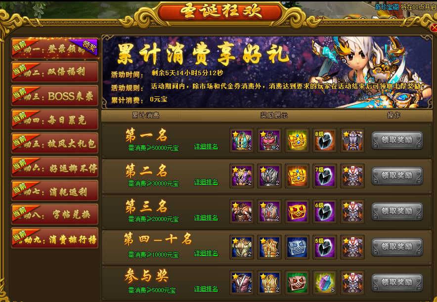 活动规则:活动期间,除去市场消费以及投资消耗,玩家消费元宝满足要求即可领取丰厚奖励;
