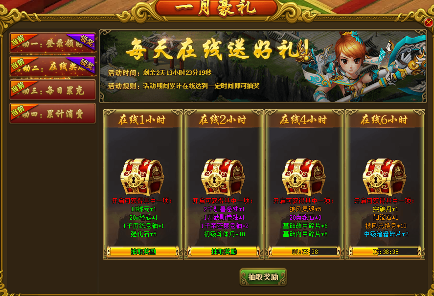 4. 每日累计充值2000元宝可获得:(姻缘石*10、中级暗器碎片*20、突破丹*8、铸造石宝箱*20)4选一、绑元*500、副本卷轴*10、乾坤强化石*4;