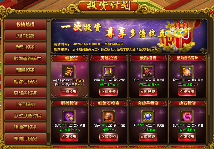 活动规则: 活动时间内,玩家可对奖励七天的道具奖励进行投资,投资需要花费一定量元宝,投资成功后,每天登录即可领取丰厚奖励。玩家开始投资某项道具投资计划之前,可进行一键投资来减少元宝消耗,但是依然可以领取正常数量的投资道具,并且无需二次投资。