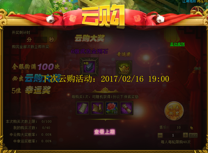 活动规则:活动期间内,每天的19-23点开启云购活动,每间隔30分钟可以参与云购,每个玩家每轮云购限制次数40,云购售卖完毕后立即开奖,往期中奖玩家可在查看上期选项中查询。