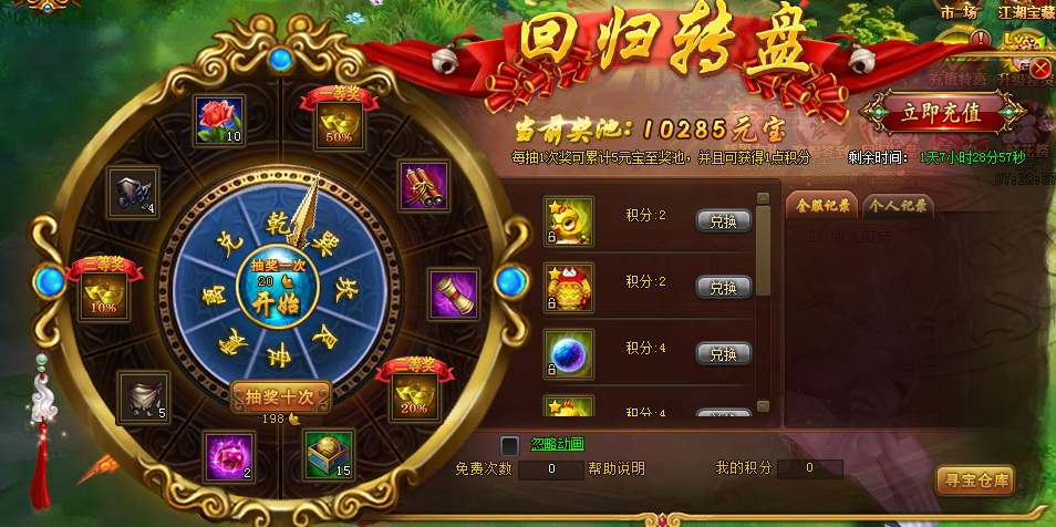 活动规则:活动期间内,玩家消耗一定量元宝来进行抽奖,玩家每抽奖一次,将会有5元宝计入奖池中,初始奖池10000元宝,玩家通过抽奖扩充奖池深度,抽奖可获得积分,每抽奖1次可获得1积分,积攒积分可以获得额外珍稀道具。