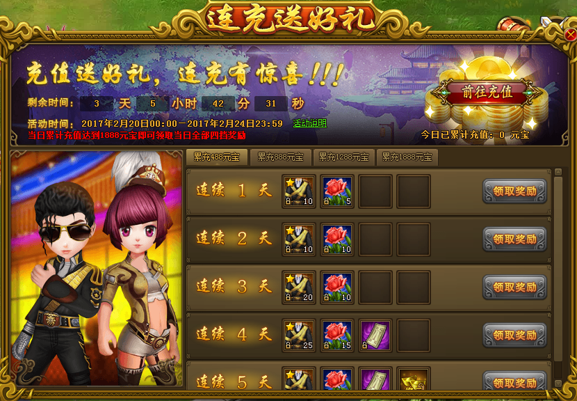 活动规则:活动时间内,累计充值达到指定金额,每天登录游戏即可获得奖励,若某充值档次未达到要求并在接下来的一天内未继续充值,则该充值奖励从第一档第一天重新开始计算,每日零点奖励若未领取则视为放弃领奖,但不影响连续充值进度。