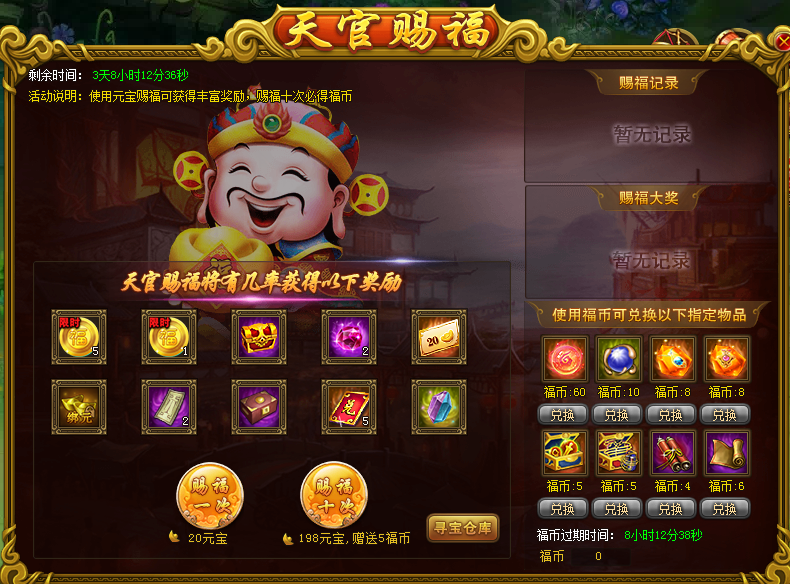 活动规则:活动期间内,玩家消耗一定量元宝来进行赐福,赐福一次消耗20元宝,赐福十次必定获得5福币, 除去赐福获得的奖励道具外,福币可额外兑换稀有道具,福币每天24:00清空,玩家赐福获得的道具会放置在玩家寻宝仓库内,福币兑换的道具则直接进入玩家背包。