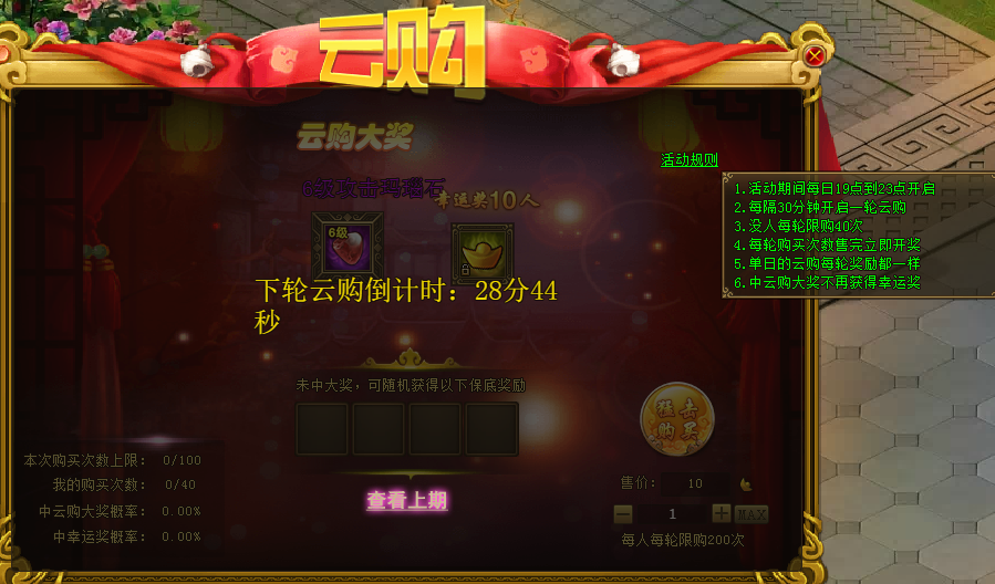 活动规则:活动期间内,每天的19-23点开启云购活动,每间隔30分钟可以参与云购,每个玩家每轮云购限制次数40,云购售卖完毕后立即开奖,往期中奖玩家可在查看上期选项中查询。
