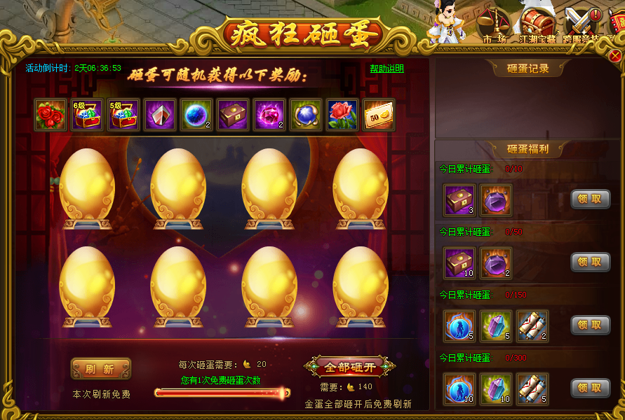 活动规则:活动期间内,玩家消耗20元宝即可进行砸蛋,或直接消耗140元宝,直接砸开8个金蛋,当前金蛋全部被砸开后,自动刷新金蛋,砸开金蛋必定获得道具奖励,砸蛋次数符合要求,即可立即领取砸蛋福利,多砸多送。刷新金蛋有几率出现高级金蛋,高级金蛋砸开后奖励更加丰厚。