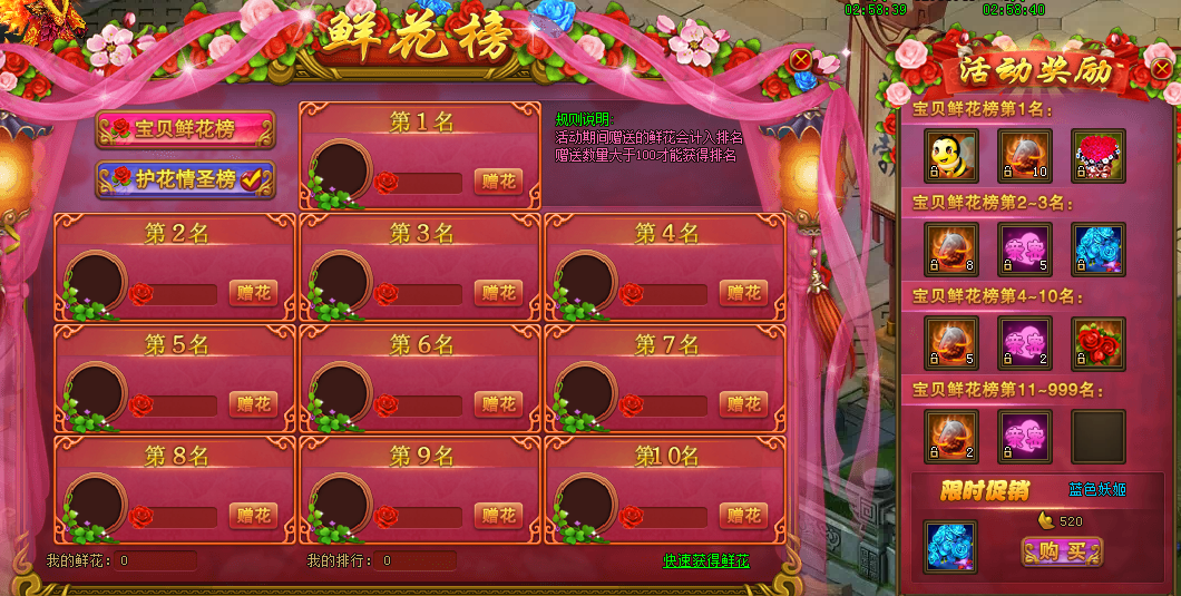 活动期间,玩家可购买限时特殊鲜花蓝色妖姬,价值520元宝的蓝色妖姬可提供600点甜蜜度,购买了鲜花或者收到鲜花满足要求但是没有上榜的玩家需要注意:两个榜单的刷新时间为15分钟,请耐心等待榜单刷新。鲜花榜和护花榜奖励不同,具体如下图所示: