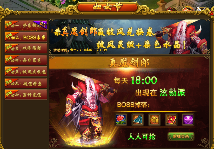 活动规则:活动期间,每晚18:00,真魔剑郎都会出现在泫勃派地图内,玩家击杀世界BOSS即可掉落海量绑元,橙色装备,以及稀有珍惜道具。
