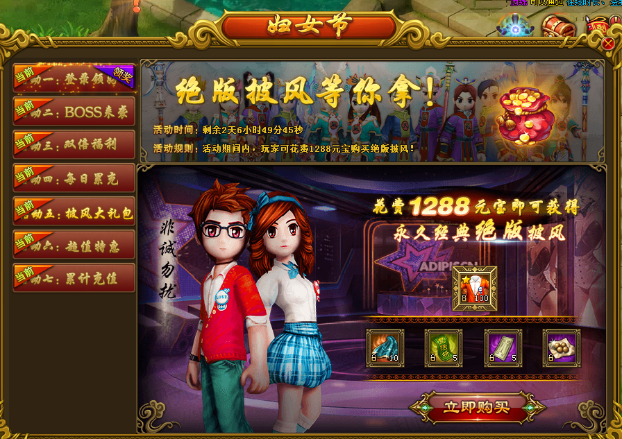 活动规则:活动期间内,玩家可花费1288元宝购买绝版披风;