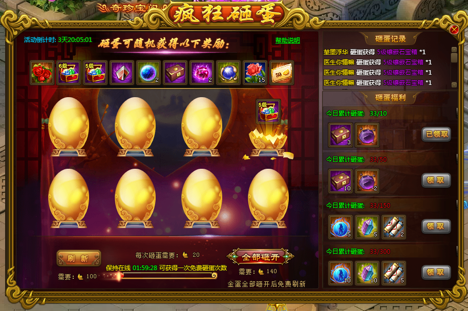 活动规则:活动期间内,玩家消耗20元宝即可进行砸蛋,或直接消耗160元宝,直接砸开8个金蛋,当前金蛋全部被砸开后,自动刷新金蛋,砸开金蛋必定获得道具奖励,砸蛋次数符合要求,即可立即领取砸蛋福利,多砸多送。刷新金蛋有几率出现高级金蛋,高级金蛋砸开后奖励更加丰厚。