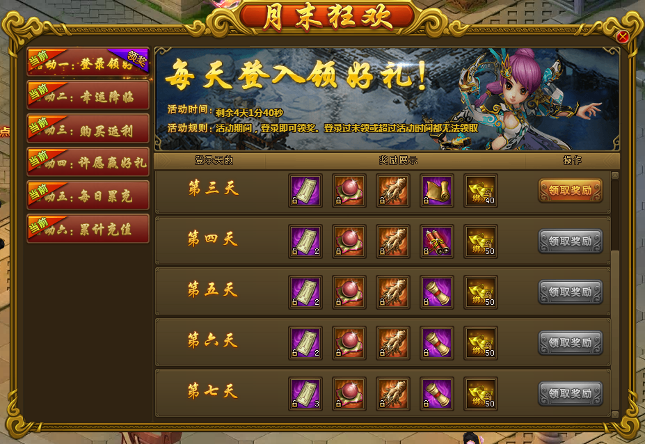 4. 第四天登录即可领取:50绑元、副本卷轴*2、至尊九转丹*1、至尊千年雪参*1、2W武勋卷轴*1;