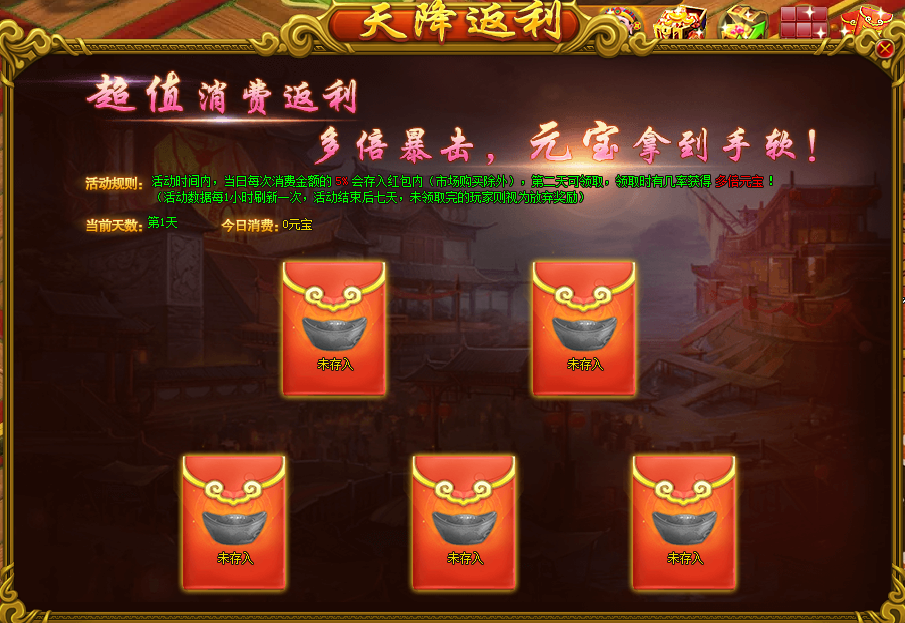 活动规则:活动期间内,每次消费额的5%将会存入红包,红包第二天可以领取,领取时几率获得多倍元宝,活动每小时更新一次数据,活动结束后七天,未领取的奖励将无法领取。