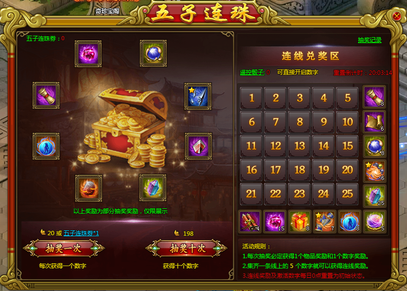 活动规则: 活动时间内,玩家花费20元宝或五子连珠券可单次抽奖,也可直接花费198元宝进行十连抽,每次抽奖必定获得1个物品奖励和数字奖励,集齐一条直线的数字即可获得对应连线奖励,连线奖励和激活数字每天0点重置为初始状态。