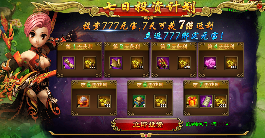 活动规则:活动时间内,玩家可对奖励七天的道具奖励进行投资,投资需要花费一定量元宝,投资成功后,每天登录即可领取丰厚道具奖励和绑元奖励。