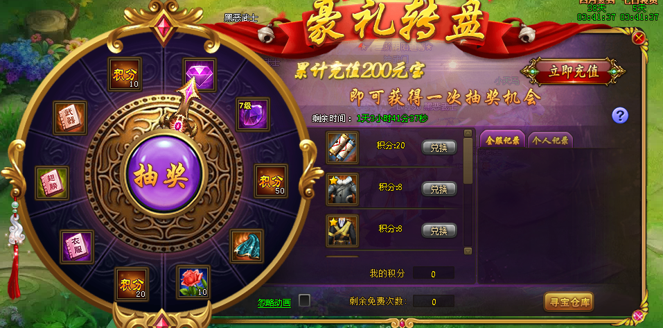 活动规则:活动期间内,玩家每累计充值200元宝,即可获得一次抽奖机会,抽奖可获得珍贵道具和积分,积分可额外兑换稀有道具。
