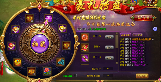 活动规则:活动期间内,玩家每累计充值200元宝,即可获得一次抽奖机会,抽奖可获得珍贵道具和积分,积分可额外兑换稀有道具。