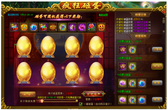 活动规则:活动期间内,玩家消耗小金锤即可进行砸蛋,砸蛋一次需要消耗小金锤*1;直接砸开8个金蛋需要消耗小金锤*8,购买一个小金锤需要消耗20元宝。当前金蛋全部被砸开后,自动刷新金蛋,砸开金蛋必定获得道具奖励,砸蛋次数符合要求,即可立即领取砸蛋福利,多砸多送。刷新金蛋有几率出现高级金蛋,高级金蛋砸开后奖励更加丰厚。