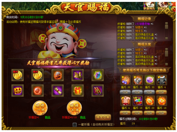 活动规则:活动期间内,玩家消耗祈福签来进行赐福,购买一只祈福签需要消耗20元宝,赐福十次必定获得5福币, 除去赐福获得的奖励道具外,福币可额外兑换稀有道具,福币每天24:00清空,玩家赐福获得的道具会放置在玩家寻宝仓库内,福币兑换的道具则直接进入玩家背包。