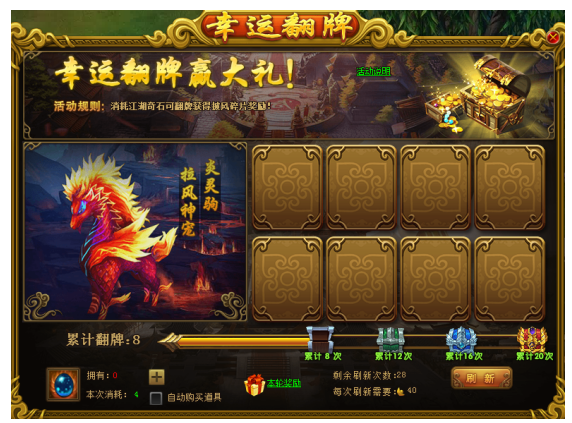 活动规则:活动期间内,玩家可消耗江湖奇石进行翻牌,翻牌可以获得相应的奖励,累计翻牌达到一定次数,也有奖励可以领取。