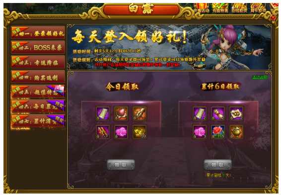 普通用户累计6天:副本卷轴*2、1千亲密度*3、2千驯兽卷轴*2、1.5倍圣心丹*2、单恋玫瑰*5、2000万经验宝葫*1。