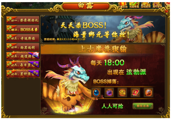 活动规则:活动期间,每天18:00都会在泫勃派出现boss,击杀可掉落相应奖励。