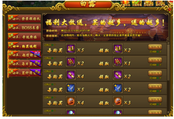 3. 第三天登录即可领取:40绑元、副本卷轴*2、至尊九转丹*1、至尊千年雪参*1、2千驯兽卷轴*1、1千亲密度卷轴*1;