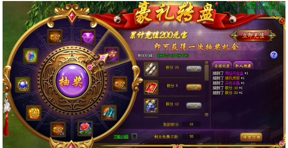 活动规则:活动期间内,玩家每累计充值200元宝,即可获得一次抽奖机会,抽奖可获得珍贵道具和积分,积分可额外兑换稀有道具。