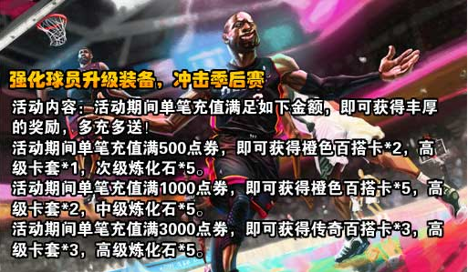 篮球比赛需要的是信念,球员每分每秒的训练,以及专业的装备!在季后赛开赛期间,我们为各位玩家准备了丰富精彩的强化活动,让各位经理的球员更加强大,让心爱的球员装备更加专业!