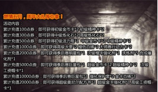 累计充值2000点券,即可获得季后赛明星包*1 次级橙卡强化剂*1 洗炼剂*5 合成催化剂*1