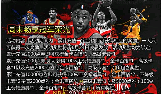 累计充值10000点券即可获得100w工资帽道具*1,金卡百搭*2,不降级卡套*2充值2000点券(金卡百搭*1,高级卡套*1)及5000点券(100w工资帽道具*1,金卡百搭*1,高级卡套*1)所有奖励。