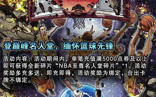 活动内容:活动期间内,单笔充值满5000点券及以上即可获得全新碎片“NBA至尊名人堂碎片”*1。活动奖励多充多送,即充即得,活动奖励为绑定,合出卡牌不绑定。