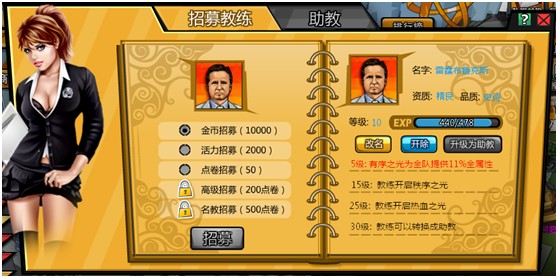 当教练到达30级后即可变成助教,助教的属性根据品质和资质获得。