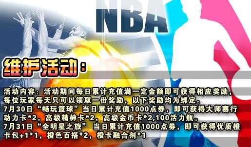 7月30日“畅玩篮球”当日累计充值1000点券,即可获得大师赛行动力卡*2,高级精神卡*2,高级金币卡*2,100活力瓶。