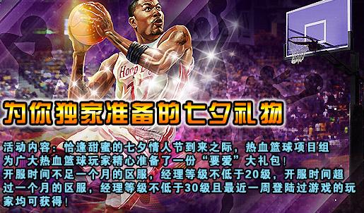 活动内容:恰逢甜蜜的七夕情人节到来之际,热血篮球项目组为广大热血篮球玩家精心准备了一份“要爱”大礼包!