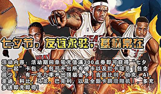 活动内容:活动期间单笔充值满300点券即可获得“七夕在一起”卡包,卡包可开出所有橙卡以及红卡球员(包含威少),有一定几率开出顶级金卡(吉诺比利,帕克,AI,麦迪,科比,马龙,巴克利,以及全新卡牌滑翔机),多充多送即充即得
