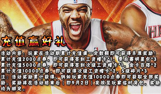 累计充值2000点券,即可获得签到工资帽卡*1,季后赛明星包*3