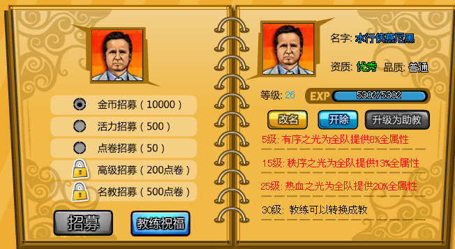 教练祝福系统为拥有教练的玩家每日提供一次精神金币奖励(每日只可领取一次)。奖励的数量将由教练的资质以及等级决定。